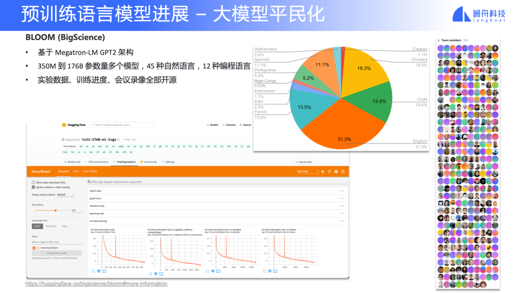 除了关注 BLOOM 模型本身,我们还要关注到它的项目组织形式。 与 GPT-3 纯闭源的、顶级大厂内部研究不同,这个项目从立项开始就是开放的。其开源内容不仅是模型本身,还包含了数据治理、模型结构探索、实验数据、训练日志、线上会议录像等资料。大家可以去看一下他们中间经过了几次波折、训练中止这些问题怎么解决的。这是一个非常宝贵的资源,预计在后续半年内,BLOOM 模型还有很多迭代工作。