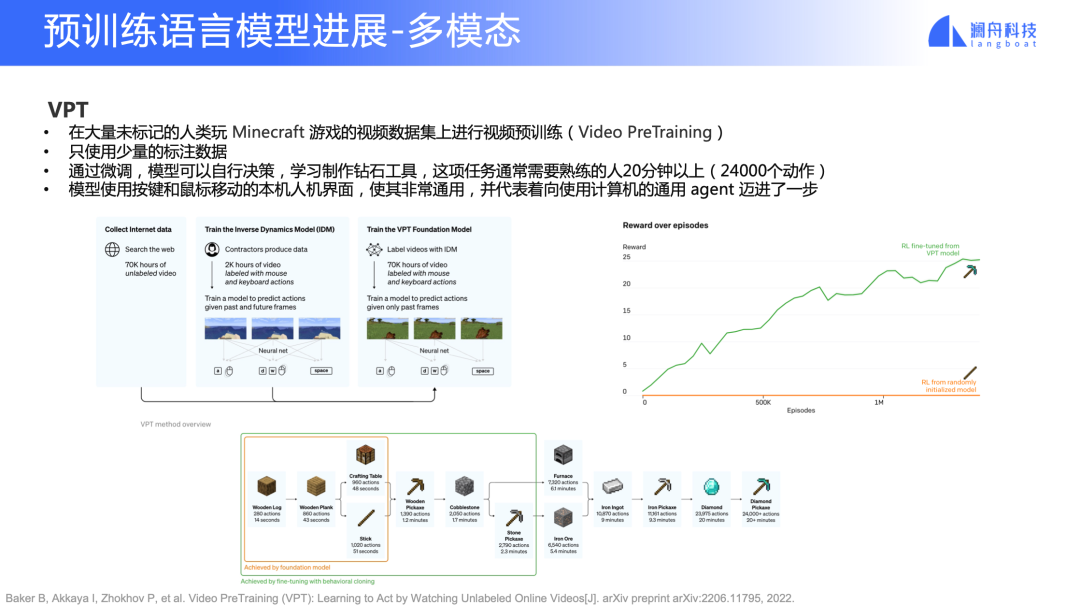 我也注意到,把大模型拓展可以构建某种意义上的通用能力模型。比如,OpenAI 的 VPT 模型:在人类 Minecraft 游戏的大规模未标记视频数据集训练一个视频预训练模型,来玩 Minecraft。