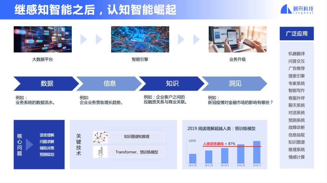 如图 1 右侧所示,认知智能的例子比比皆是。比如,达到了接近人类水准的机器翻译已经在手机和桌面普遍使用;聊天机器人几乎可以通过图灵测试;搜索引擎得益于阅读理解以及预训练模型,搜索相关度大幅度提升;自动客服系统已经普及;知识图谱在金融等领域得到快速应用。这些认知智能的能力在加速推动产业发展,从大数据出发到建立信息检索,再到建立知识图谱并实现知识推理,再到发现趋势形成观点和洞见,认知智能在大数据支持下,推动着企业的业务数智化,正深刻地影响产业的发展。可以说 NLP 和认知智能代表了人工智能的未来发展。