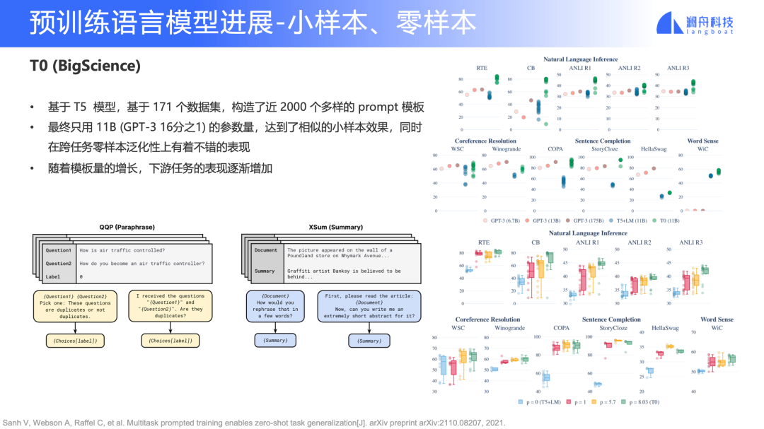 下图是 Huggingface 发起的“BigScience” workshop 中的一项工作,该模型取名为 T0。T0 选择的是 T5 的架构,但是它的数据量更多。T0 总共构造了 171 个数据集,最终构造了 2000 个多样的 Prompt 模板,最终用 11B 参数量(GPT-3 的 1/16)达到了和 GPT-3 相似的效果。