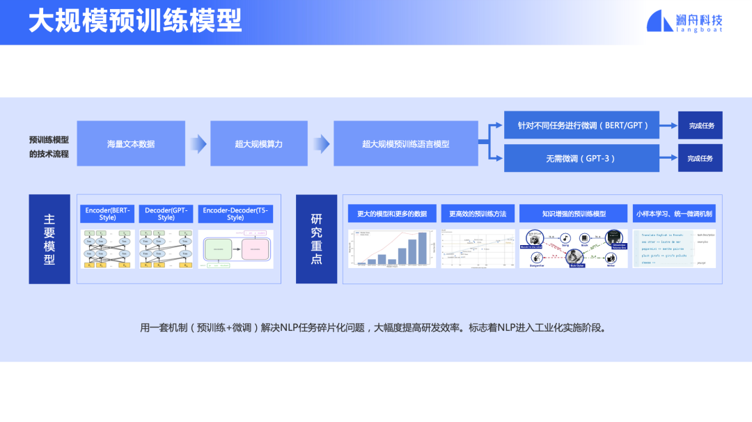 当前在预训练模型领域较为关注的研究重点包括:如何训练超大规模参数的模型、对已有模型架构的创新性研究、更加有效的训练方法和训练加速的方法。还有简化微调的步骤,比如像 GPT-3 那样用一套提示机制来统一所有下游任务的微调,推动零样本学习和小样本学习。除此之外,多模态预训练模型和推理加速方法也是目前的研究焦点。
