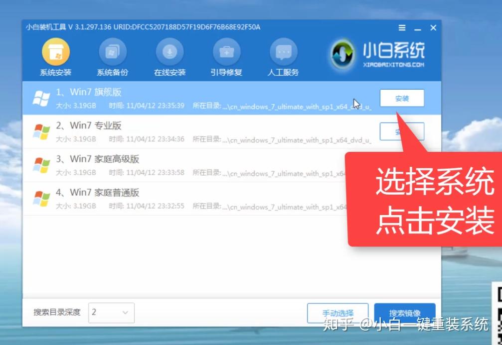 5、等待加载完成后,选择需要安装的系统win7,然后点击安装按钮,下图所示: