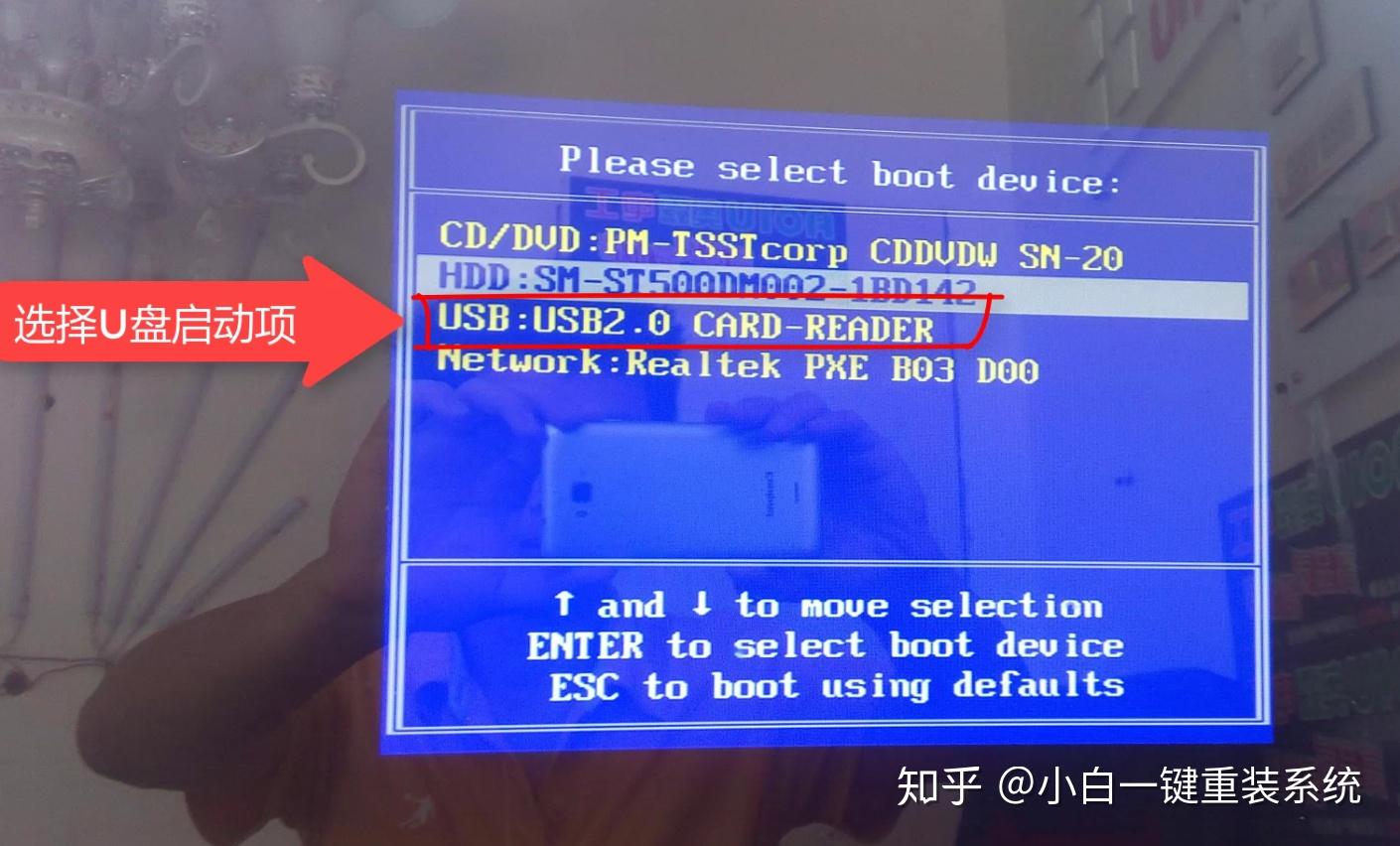 3、接着出现启动菜单,选择USB字眼的选项,通过方向键上下移动,按回车键选择,下图所示: