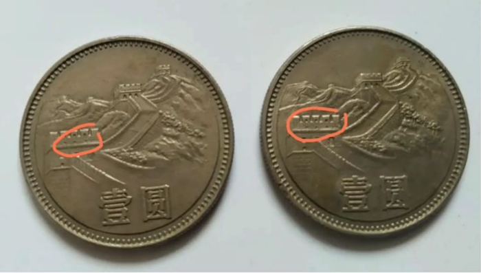 所以大家不要被一些别有用心的人欺骗,无砖版只出现在1980年1元长城币当中,我们可以看一下图片中红圈标记的城垛位置,长城城垛位置无砖即无砖版,目前流通品相的无砖版几百元一枚,也就是说它的收藏价格是面值的几百倍。