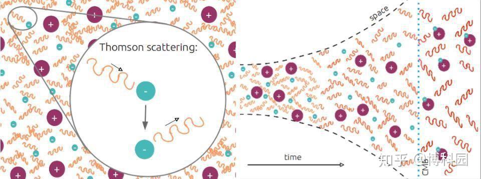 宇宙中电子和质子是自由的,它们与光子发生碰撞,在宇宙膨胀和冷却的过程中,转变成对光子来说是透明的中性宇宙。图这里显示的是在宇宙微波背景辐射(CMB)发射之前的电离等离子体(L),接着是向一个中性宇宙(R)的过渡,这对光子来说是透明的。图片:AMANDA YOHO