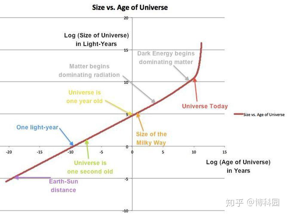 宇宙的大小以光年为单位,与大爆炸后的时间相比,这是在对数标度上给出的,其中为了清楚而注释了大量重要事件,这仅适用于可观测到的宇宙。图片:E. SIEGEL