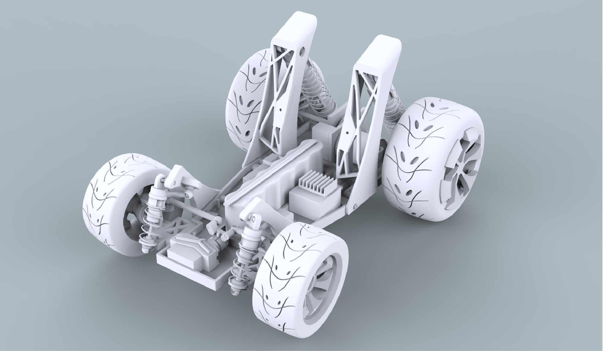 这是重新设计之后的遥控车,概念是设计一款适合沙漠地形作战的战车,所以加强了车后部的避震系统,并且加宽了前后的轮胎: