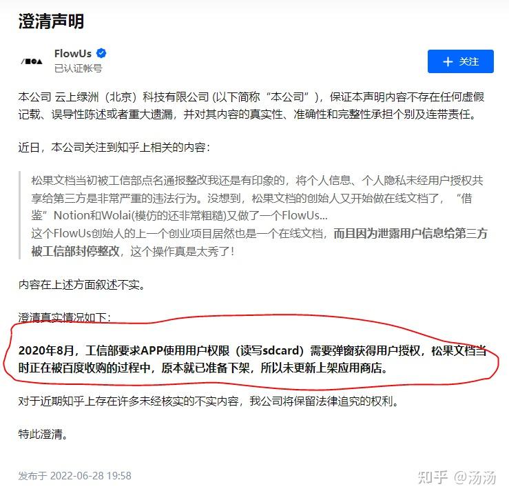 但是flowus发了一个声明却把我搞懵了,声明中,flowus宣称 2020年8月,工信部要求APP使用用户权限(读写sdcard)需要弹窗获得用户授权,松果文档当时正在被百度收购的过程中,原本就已准备下架,所以未更新上架应用商店。