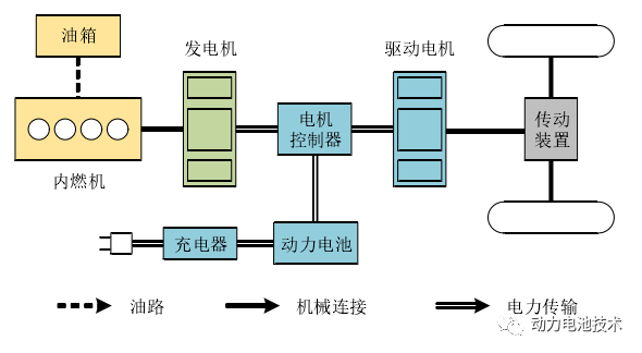 插电式串联混合动力汽车,也称为增程式电动汽车,相当于对纯电动汽车增加一套增程装置,其混合动力系统的结构如下图所示,主要由一个驱动电机、一套由内燃机、发电机构成的增程装置、传动装置、电机控制器、动力蓄电池组和外部充电接口等几个部件组成。