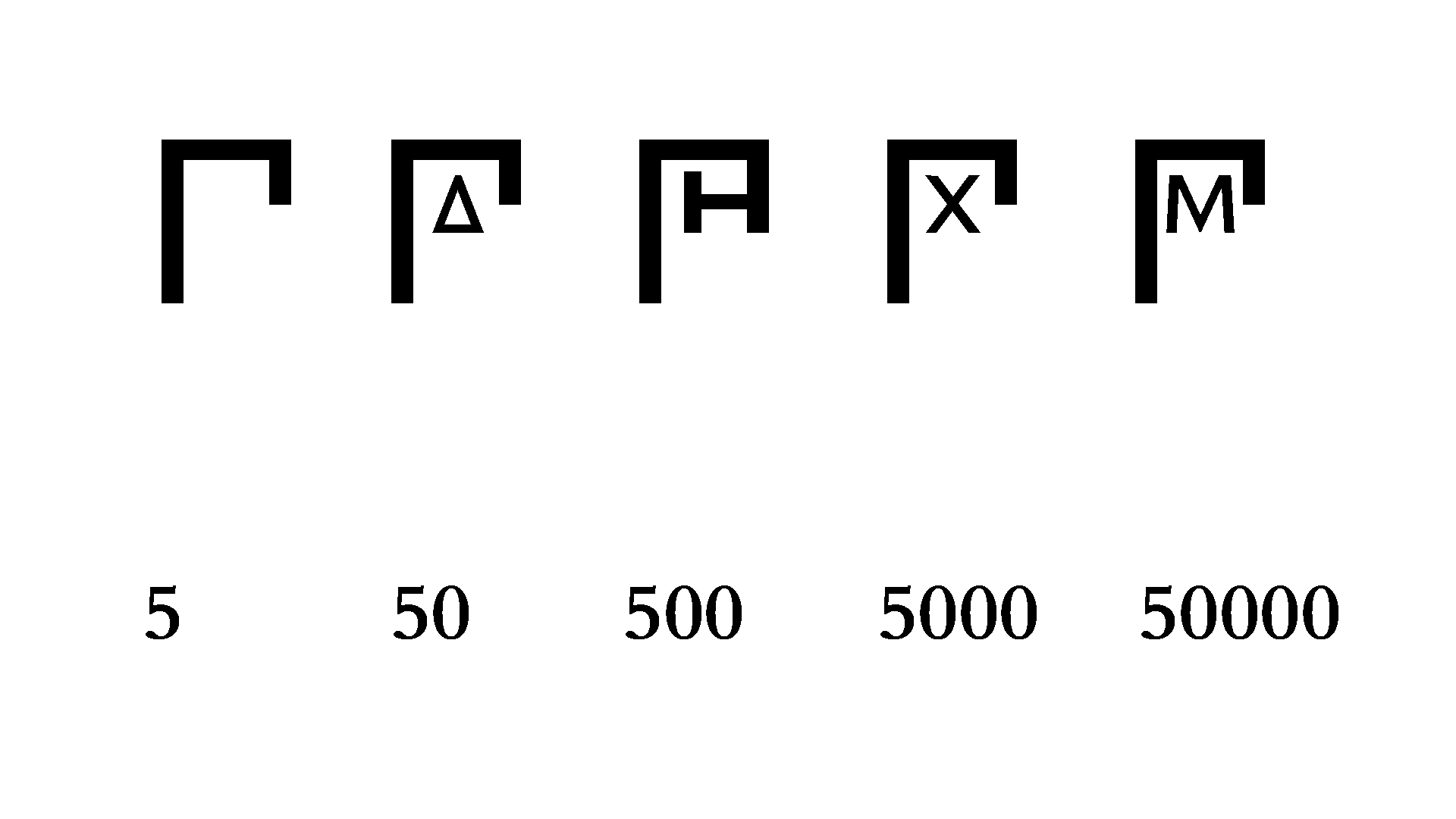 - 数字5(πέντε)截头记作Π(其实更准确的应该是U+10143, ,字母Π的旧体), 5\times10^1 记作 (U+10144;顾名思义, Π\timesΔ ), 5\times10^2 记作 (U+10145;顾名思义, Π\timesΗ ), 5\times10^3 记作 (U+10146;顾名思义, Π\timesΧ ), 5\times10^4 记作 (U+10147;顾名思义, Π\timesΜ )