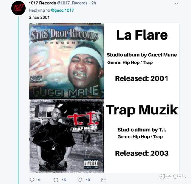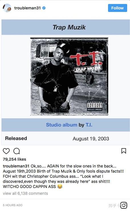 紧接着,T.I也不甘示弱,在之后发推贴出了自己在2003年专辑《Trap Muzik》反驳了Gucci Mane的说法