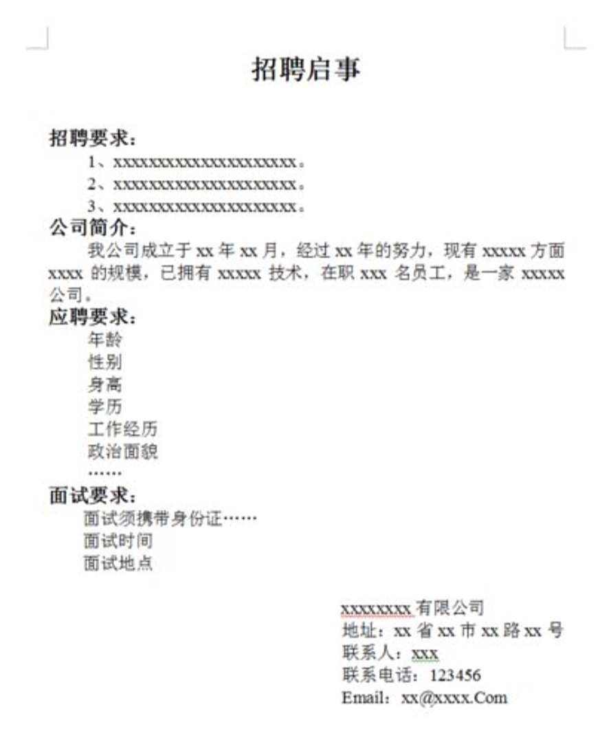 直接干脆,三言两语。直接引出招聘正题,简洁明了,以招聘信息的发布为主。这比较适合知名度较高的企业单位采用。