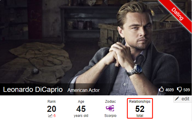 这好像都是小李子要安顿下来的信号? 但这不符合小李子一贯的“海王”人设啊! 美国著名吃瓜网站 whosdatedwho 上显示, 小李子曾先后交往过 51 任女友,平均交往时长不超过 1 年。
