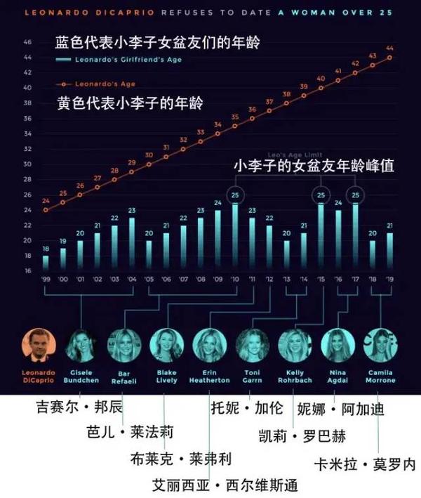 随着黄色线的增长,蓝色线却保持在大致的水平线上,最大也没有超过 25 岁。 小李子对年轻女孩的执着喜爱,不是什么秘密。 今年 1 月金球奖上,主持人就当着小李子的面,拿女友年纪开他的新片《好莱坞往事》时长的玩笑。 说小李子参加完 3 小时的首映出来,他约会的姑娘都要超龄了。
