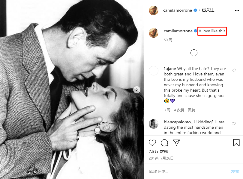 卡米拉唯一一次在 ins 发感情相关的动态,是一组好莱坞传奇情侣、年纪相差 25 岁的亨弗莱·鲍嘉和劳伦·白考尔的照片,并配文: “像这样的爱” 。