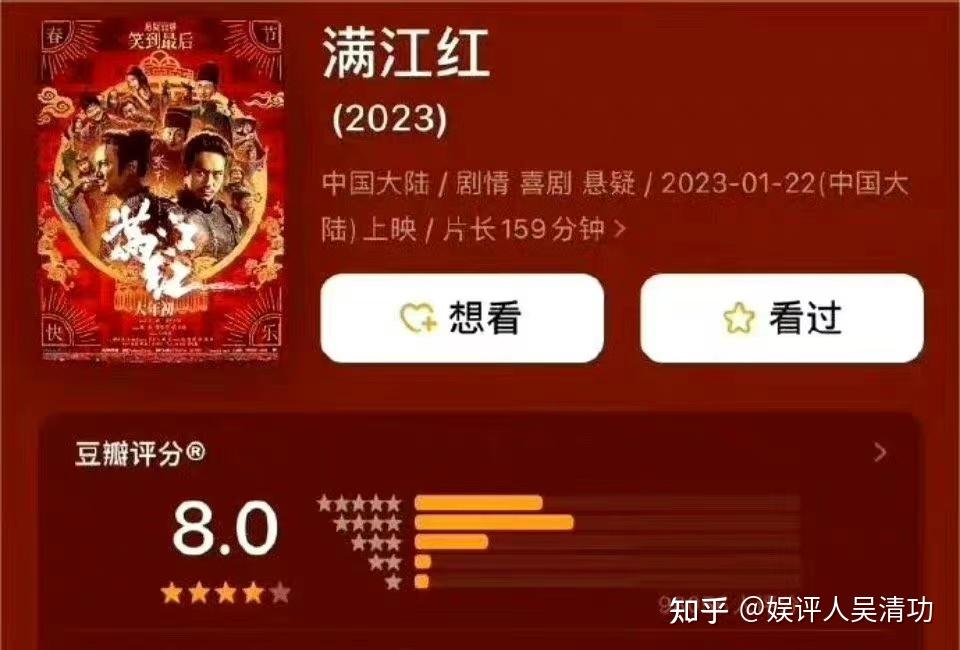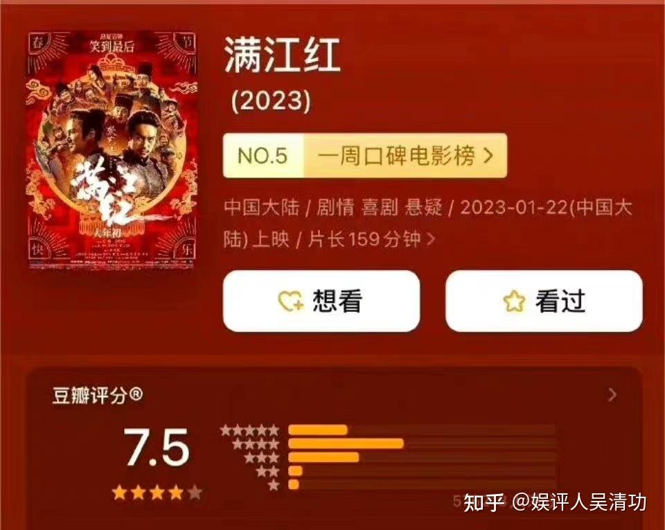 《满江红》豆瓣开分8分,如今已经掉到了7.5分。《满江红》的上座率也被《流浪地球2》反超了,在不久的将来,或许排片率、单日票房、总票房都会被《流浪地球2》反超。《流浪地球2》由郭帆执导,吴京和刘德华主演。