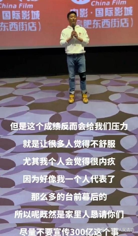 对此,吴京在路演里说“不要宣传300亿”这件事:“个人会觉得很内疚,好像我一个人代表了那么多台前幕后的(工作人员),恳请你们尽量不要再宣传300亿(票房)这件事。”吴京的淡泊名利和《满江红》片方的唯利是图,形成鲜明对比。