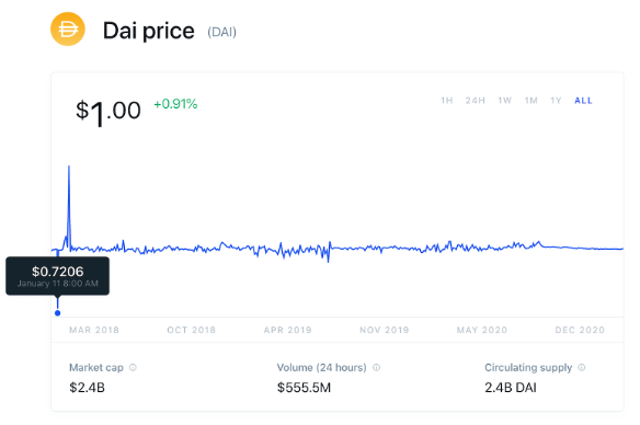 换个角度, 从2020年2月4日到2020年3月13日这段时间, 比特币从10,500美元的高点暴跌了超过60%的幅度到 3,800美元的低点. 当时人们对数字货币失去了信心, 大多数主流的非稳定币都经历了至少一个腰斩, 而为什么DAI还是能稳定在1美元附近, 人们唯独没有对DAI失去信心呢?