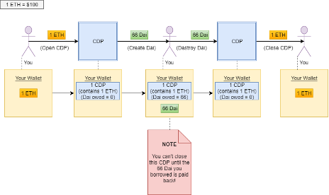 他可以任意处置由出售 DAI 所获得的价值 100美元的 ETH, 而最初始的 ETH 抵押 (价值 150美元) 被仍然锁定在 CDP 中, 直到支付债务加上稳定费用才能被偿回.