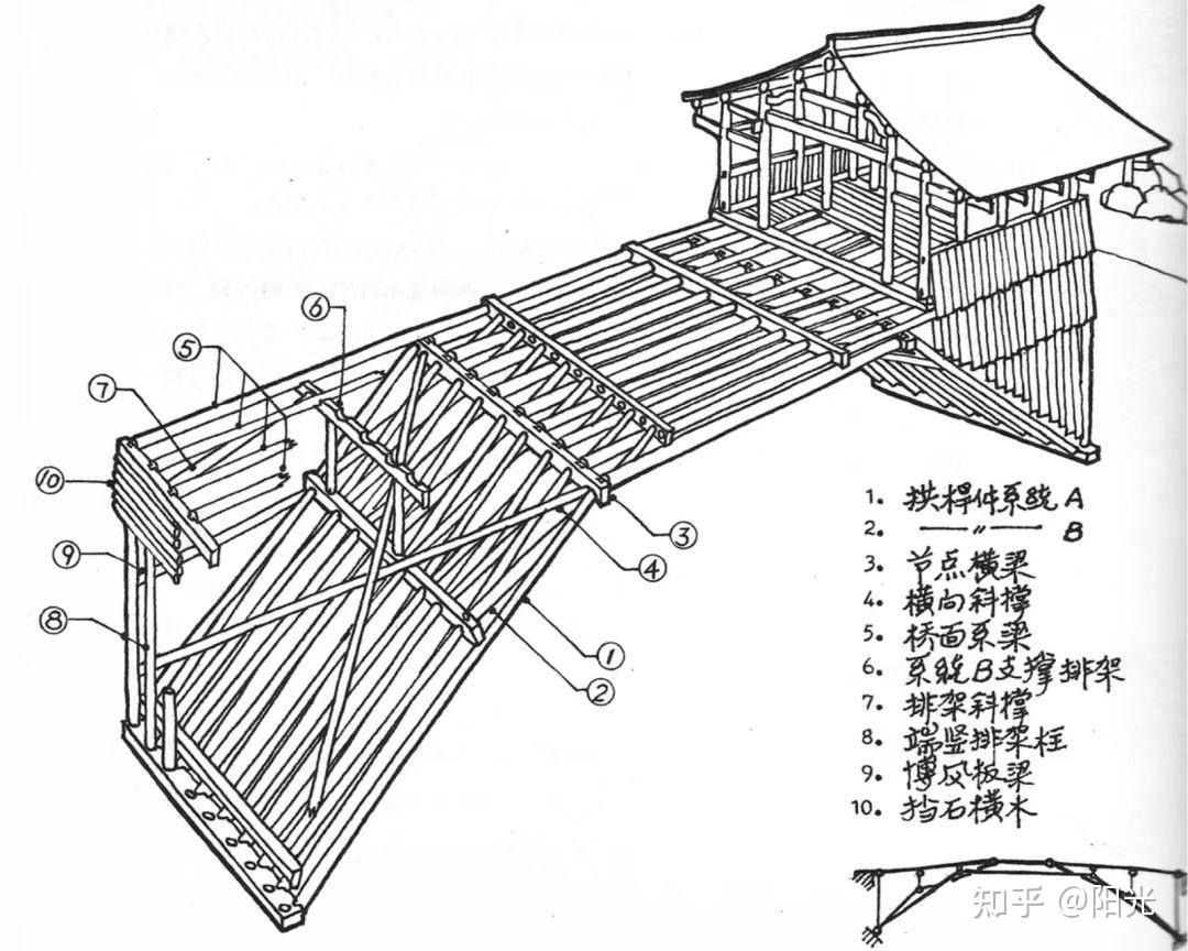 具体做法:以数百根木材,通过直木穿插,纵横相贯,榫卯对接,相互编织,利用建筑力学解决大幅拱跨受力难题。