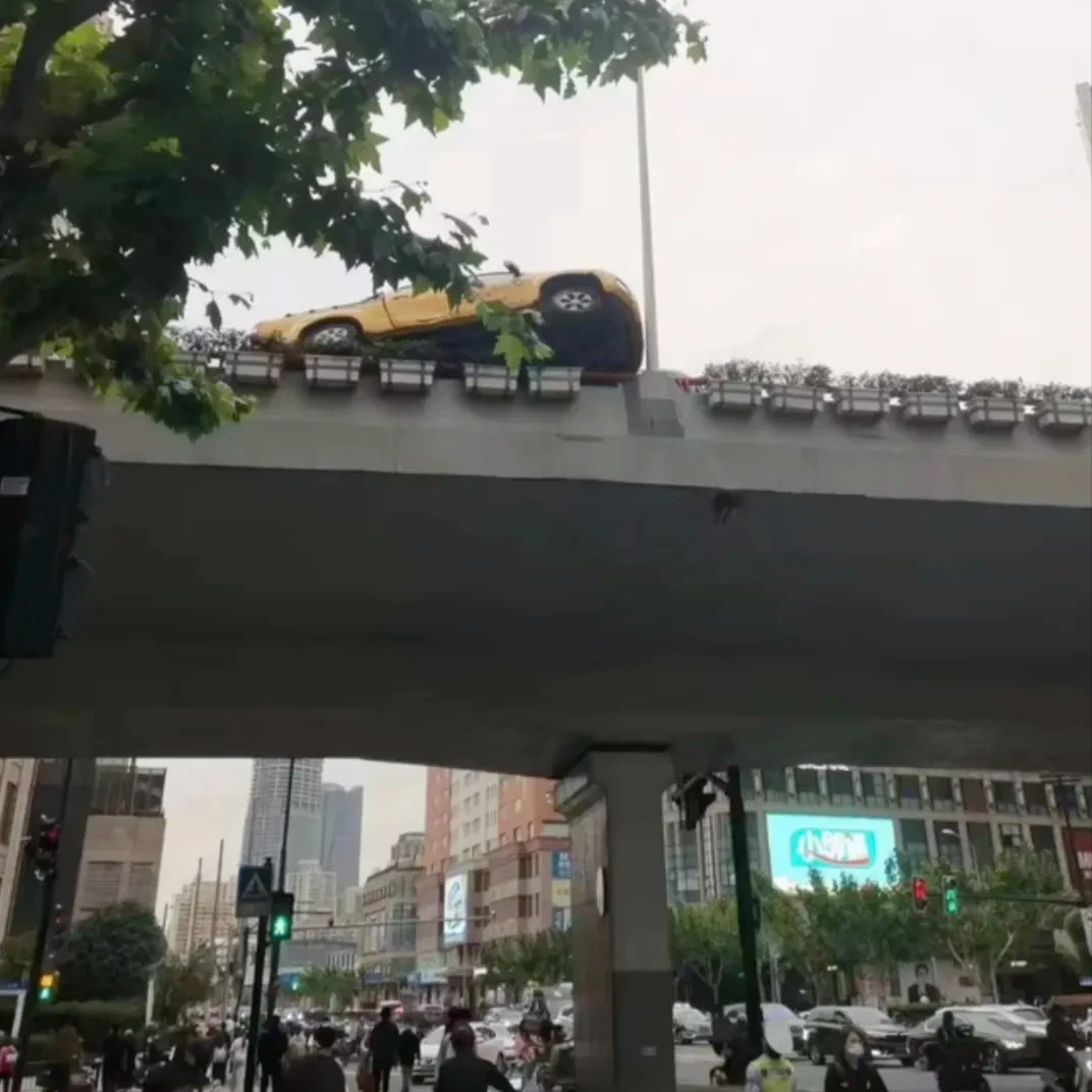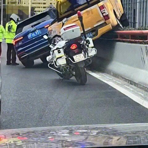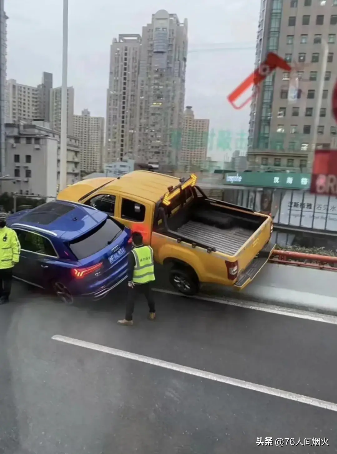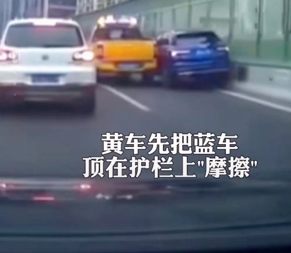 值得一提的是,在此过程中,蓝色车一度把黄色车顶到了高架桥的最边缘处,若不是当时有着护栏的存在,可能黄色车子已经发生意外了。