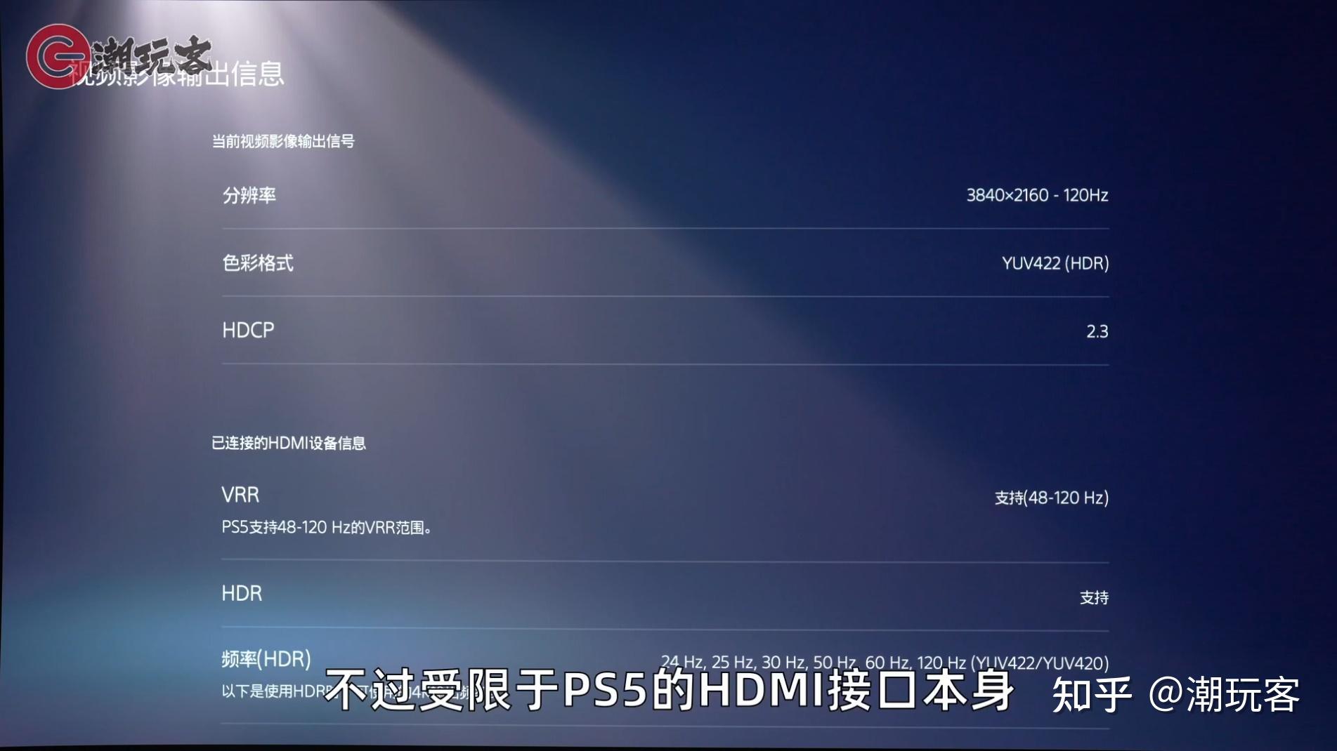连接PS5能够支持4K 60Hz RGB全范围输入,同时支持48-120Hz的VRR可变刷新率,不过受限于PS5的HDMI接口本身,所以120Hz下,色彩格式并不能支持RGB,只有YUV422。