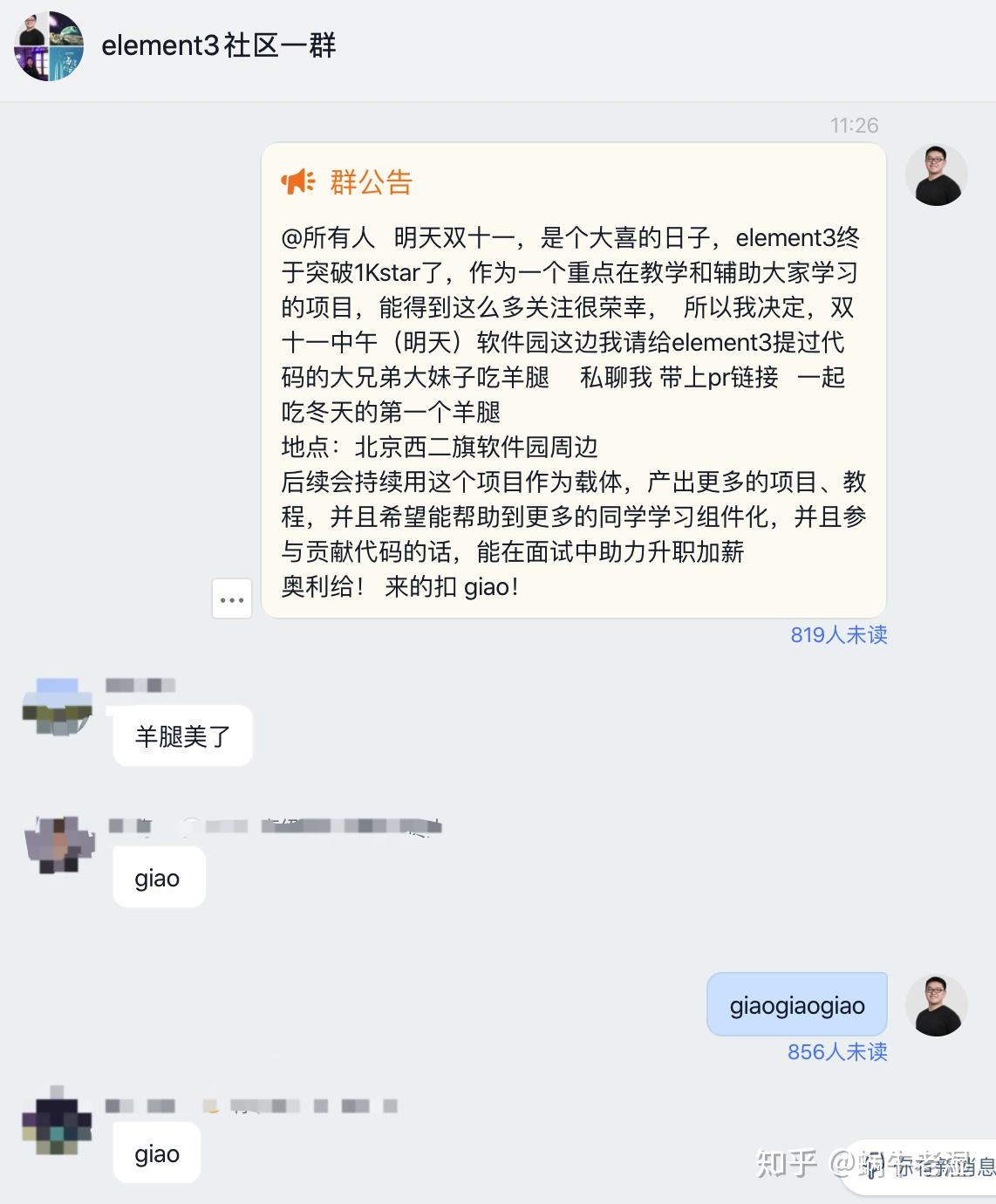 element3终于突破1Kstar了,作为一个重点在教学和辅助大家学习的项目,能得到这么多关注很荣幸, 所以我决定,双十一中午(明天)软件园这边我请给element3提过代码的大兄弟大妹子吃羊腿 私聊我 带上pr链接 一起吃冬天的第一个羊腿