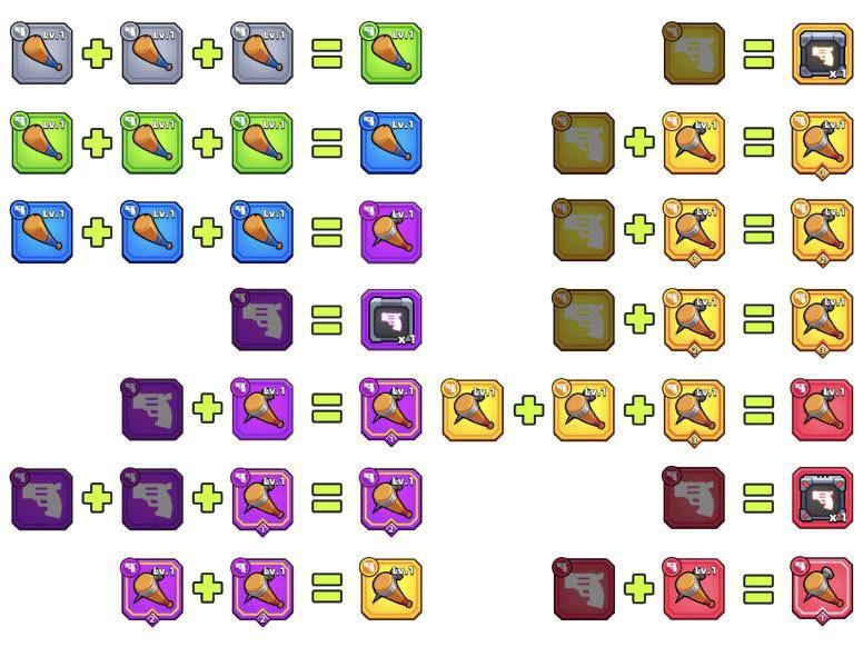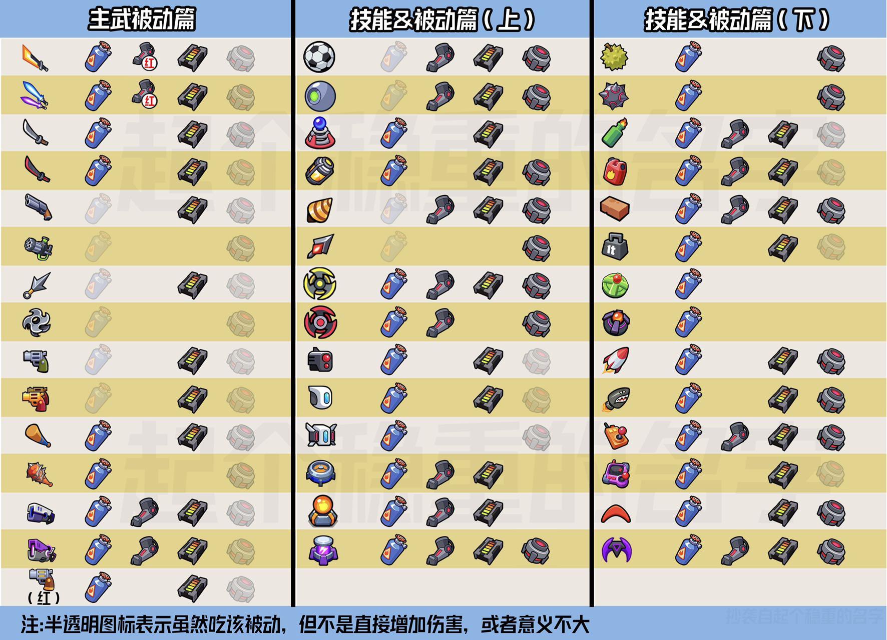 - 被动核心技能:经验书+能量瓶子(有一个就行,为了合成超武)+持久