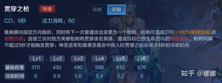 雅典娜又叫三枪女神,为什么这么讲呢,我们二技能的被动中有一句关于二技能强普的描述“连续三次对敌方英雄枪刺将贯穿该名英雄,造成目标已损生命25%的物理伤害”召唤师技能终结也仅有14%的真实伤害,而25%是什么概念呢?我们在出完黑切打脆皮的时候,脆皮只要剩下五分之一的血量,都会被三环的被动贯穿所击杀,打肉的时候也因为是百分比伤害而丝毫不虚。
