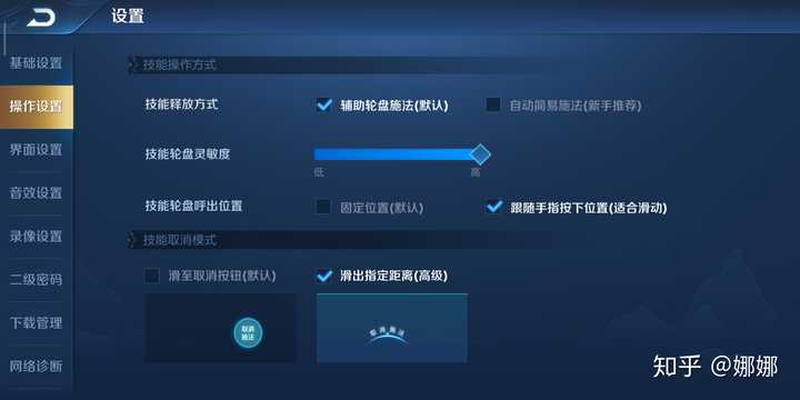 轮盘灵敏度大家可以自行设置到舒服的感觉为止,技能轮盘呼出方式改为手指滑动可以更快的在释放技能后按到普攻键,这个的具体应用也在高阶篇中的取消后摇中讲到。技能取消方式其实没什么大区别,主要还是看个人的习惯。