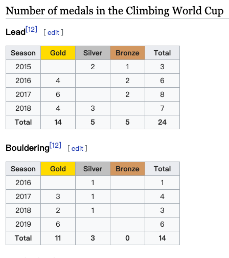 随着 2019 IFSC Vail 站世界杯的落幕,这位来自斯洛文尼亚的攀岩运动员创造了竞技攀岩的新历史,包揽了这一赛季全部 6 站攀石赛冠军(无论是在男子比赛还是女子比赛中,这一成绩都是前所未有的),以压倒性优势获得 2019 年度攀石赛世界杯总冠军。