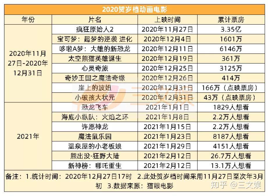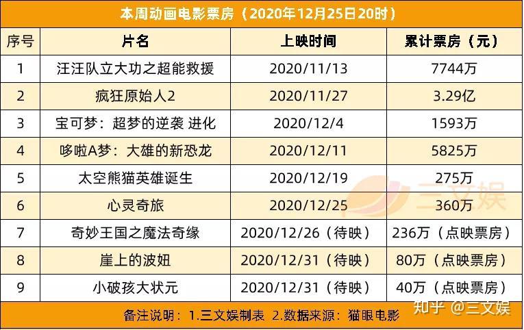 目前票房排第二、三的分别是《哆啦A梦:大雄的新恐龙》 (6146万元) 和《心灵奇旅》 (3125万元) 。值得注意的是,《心灵奇旅》于12月25日上映,目前票房3125万元,该动画是皮克斯工作室的最新作品,开局便拿下豆瓣9.2分成为年度开局最高片。