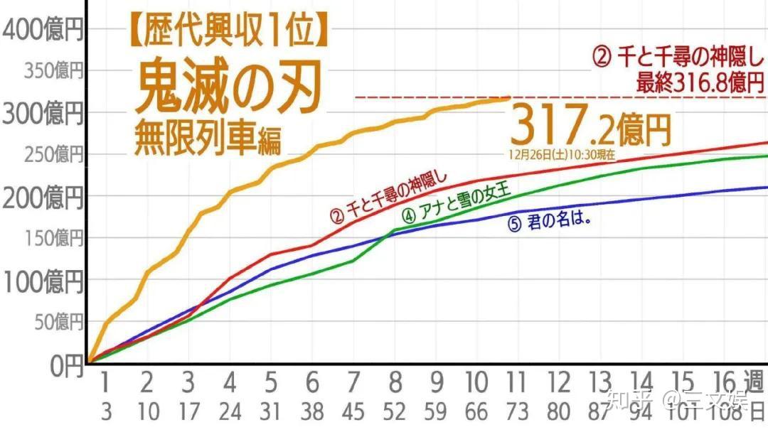 日本当地时间12月26日10点30分,上映72天的《鬼灭之刃》剧场版票房达317.2亿日元,正式超过《千与千寻》的316.8亿日元 (含复映) ,登顶日本影史票房排行榜榜首。