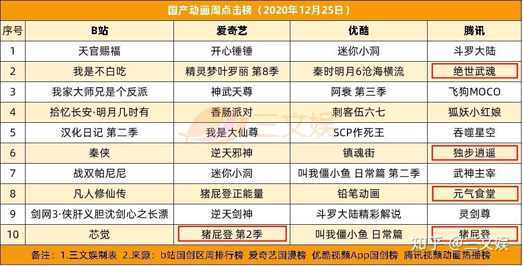腾讯视频方面, 玄机科技制作的玄幻3D动画《斗罗大陆》稳居榜首,截至12月25日,更新至136集,累计获得 244亿次播放量 。此外,本周有4部作品新晋入榜。