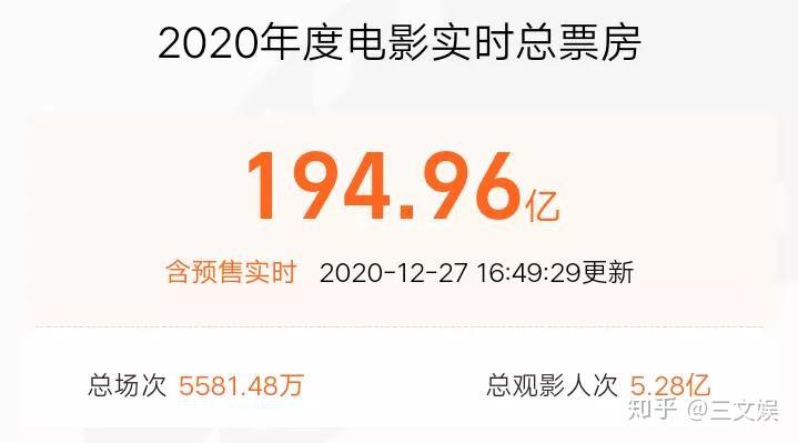 根据灯塔实时数据,12月27日16时49分,中国电影市场2020年度实时总票房 (含预售) 达到194.96亿元,总观影人次达5.28亿,累计场次达5581.48万。