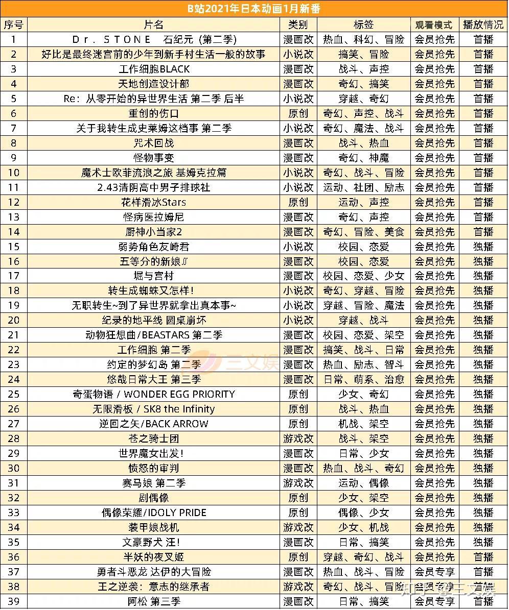 此次39部1月新番,有21部为B站独播,36部为会员抢先观看,3部为会员专享。