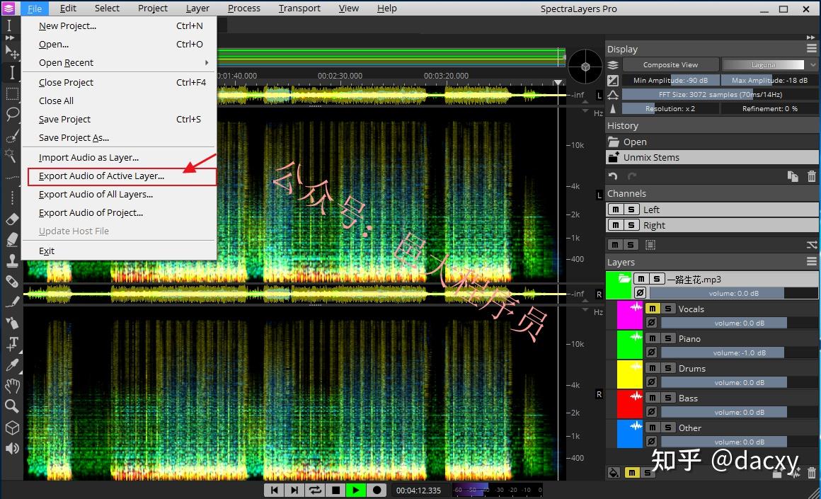 7、效果合适,就可以导出保存,点击菜单栏中的“File”,在下拉菜单中选择“Export Audio of Active Layer”项。