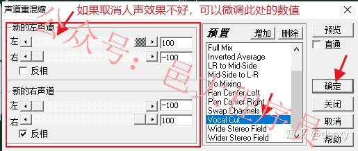 4、在弹出的对话框中,选择“VocalCut”项,然后点击“确定”按钮即可。(如果后面试听后,效果不好,可以修改一下左侧的数值,具体设置多少,只能靠自己慢慢试)