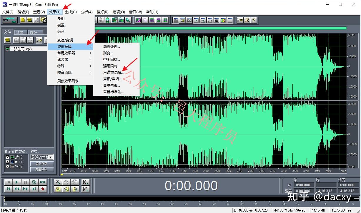 3、下面进行去掉人声的操作。在菜单中点击“效果”,在下拉菜单中点击“波形振幅”,在右侧菜单项中点击“声道重混缩”。