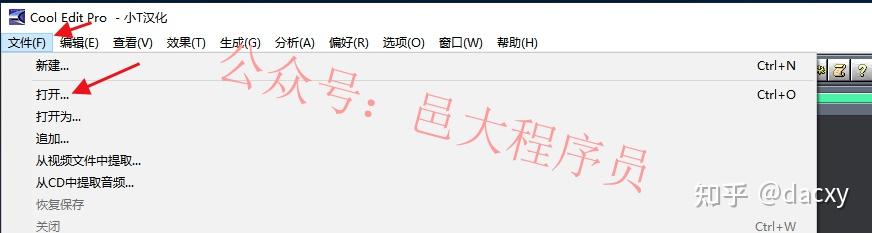1、打开Cool Edit Pro,点击“文件”菜单,在下拉菜单中点击“打开”,选择需要去掉人声的音乐。