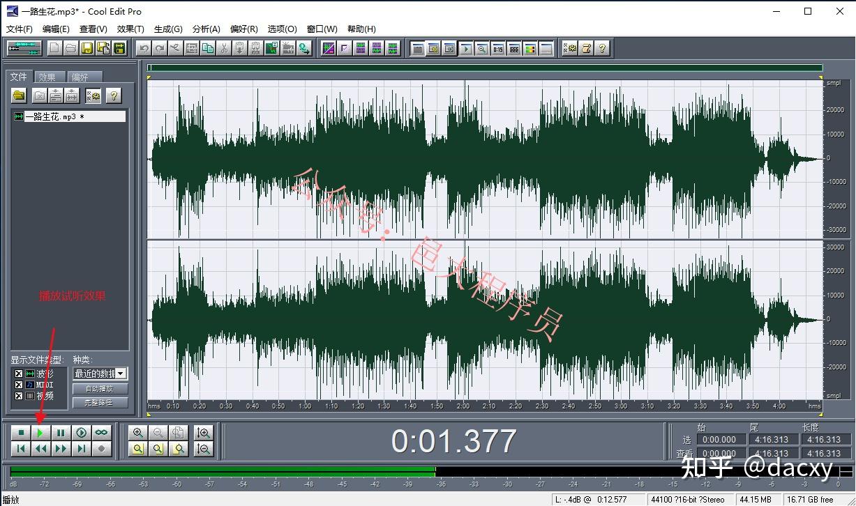 5、按空格键,试听一下效果,如果效果不理想,可以按“Ctrl + Z”,撤销刚才的操作,重新操作步骤3、步骤4,只是在步骤4中修改一个数值,直到到达满意的效果。(特别说明:Cool Edit Pro去人声,还是会有部分人声留存,而且去人声后,会丢失部分音,使得听起来比较怪)