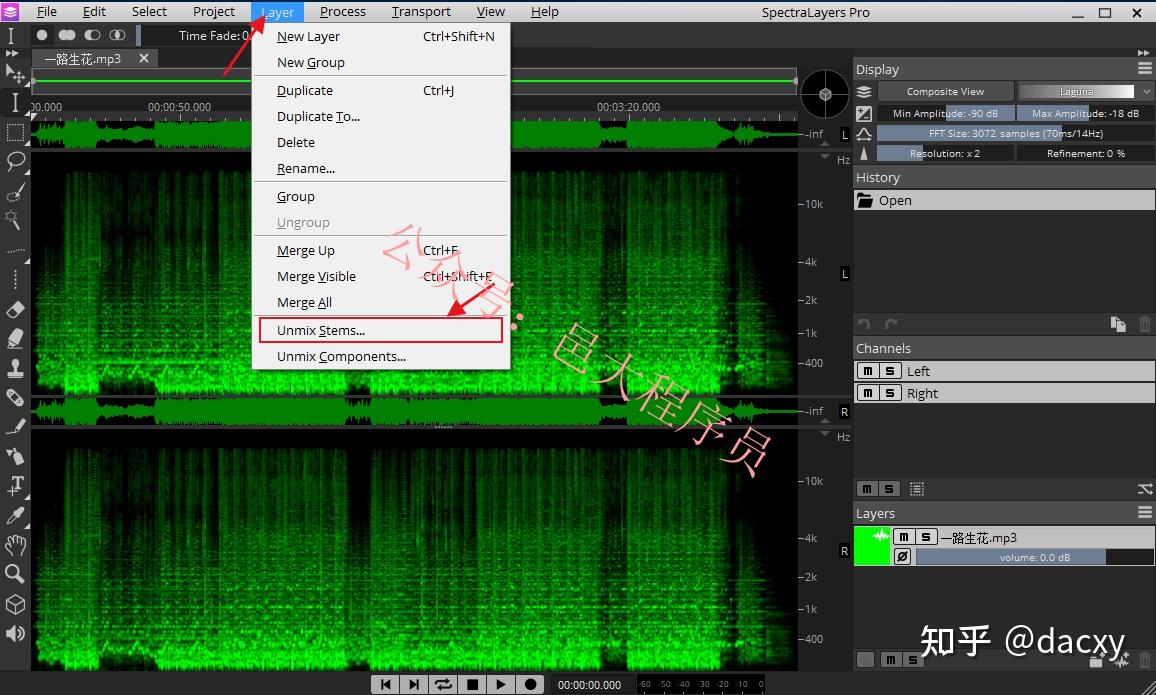 3、下面开始进行去人声的操作,点击菜单项中的“Layer”,在下拉菜单中选择“Unmix Stems”