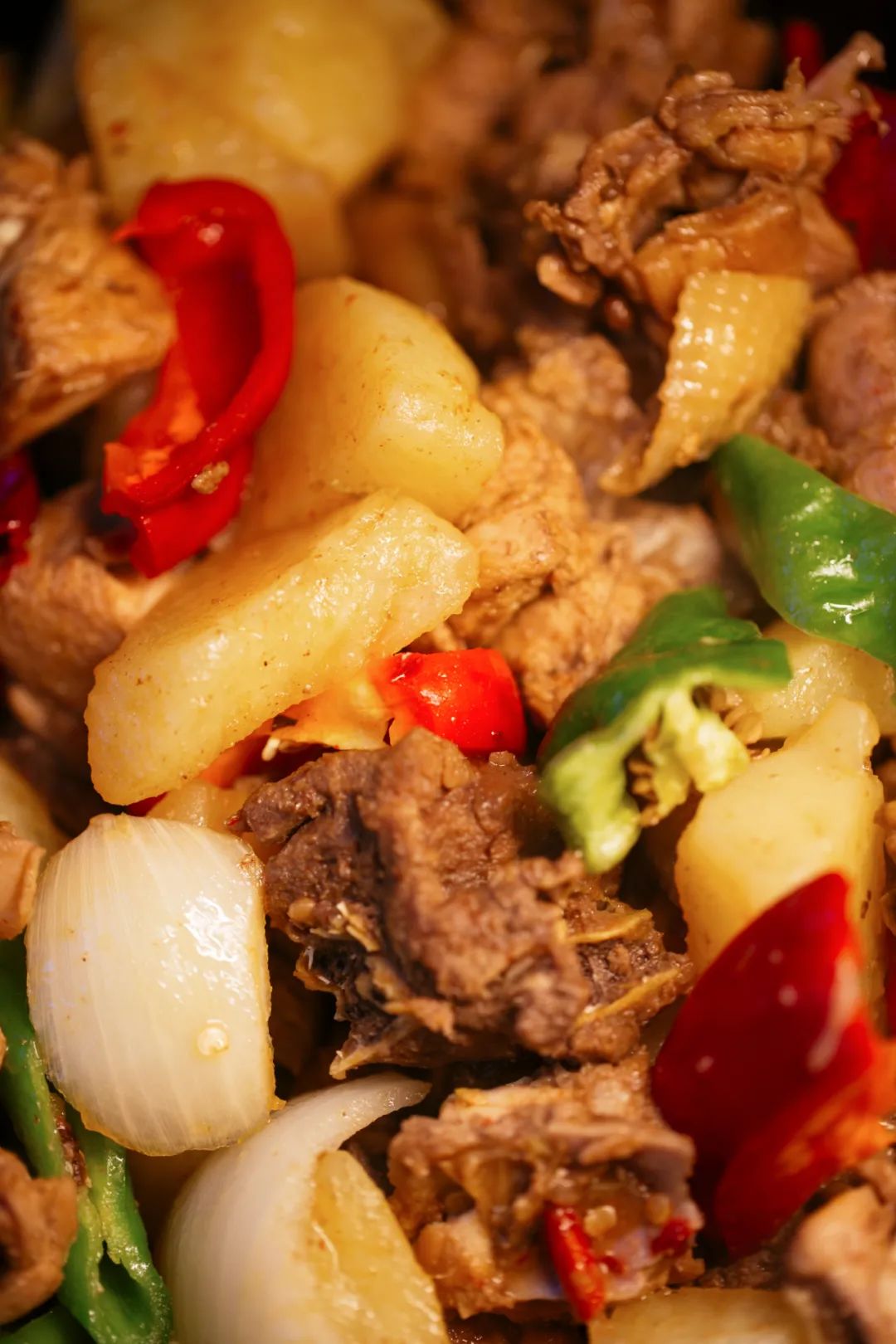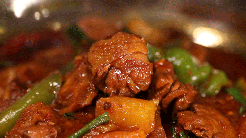 鲜红油亮的鸡块混合着饱吸了汤汁的土豆,香辣鲜在入口的瞬间被激发。土豆轻轻一夹就断,入口粉糯软烂,鸡肉弹而不柴,还吸收了所有得体的香料味儿。肉吃得差不多了,收尾的才是重头戏,