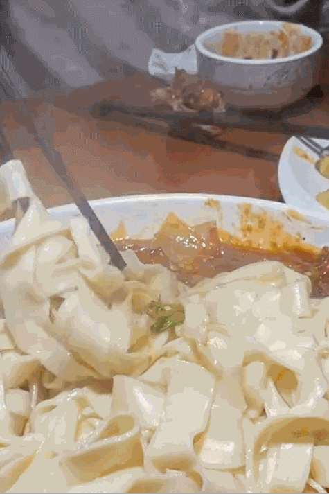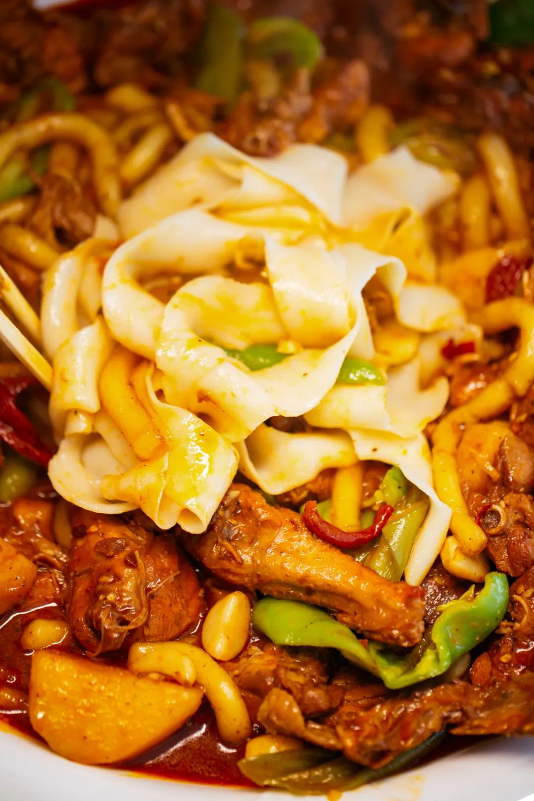 现扯的烩面下锅煮两分钟后捞出,随性地往大盘鸡上那么一盖,雪白的烩面裹满浓郁的汤汁,滑溜儿筋道,麻辣鲜香,真是面比肉都