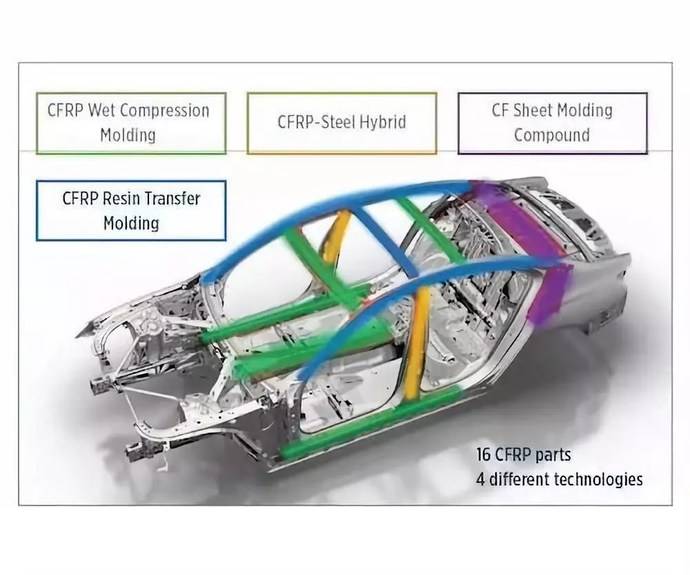 CFRP材料结合了碳纤维的强度很轻量化优势,又结合了树脂材质的批量化加工能力,一度被视作完美的新材料。即便宝马在北美兴建了号称能源自给自足的CFRP工厂,获得了稳定的低成本CFRP材料生产能力,不可否认的是,CFRP做成车身部分覆盖件或者装饰件或许还问题不大,做成整体车身还是太贵,而且CFRP材料的维修也是噩梦一样,没法钣金、没法焊接,撞坏了的地方只能用胶水粘,画面自行脑补吧。