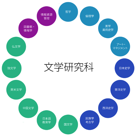 而规模更大的庆应大学文学研究科,除了基本的国文学(日本文学),英美文学外,还设置了中国文学,法国文学,德国文学等专业(绿色部分)。