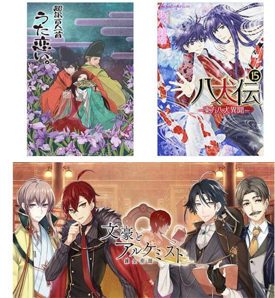 以百人一首为题材的动画,以《南総里見八犬伝》为原型的漫画,以及以近现代作家为题材的游戏