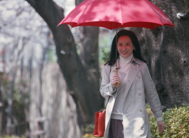 第一集中,梅雪燕在晴天里打着一把红色的伞走在樱花树下。