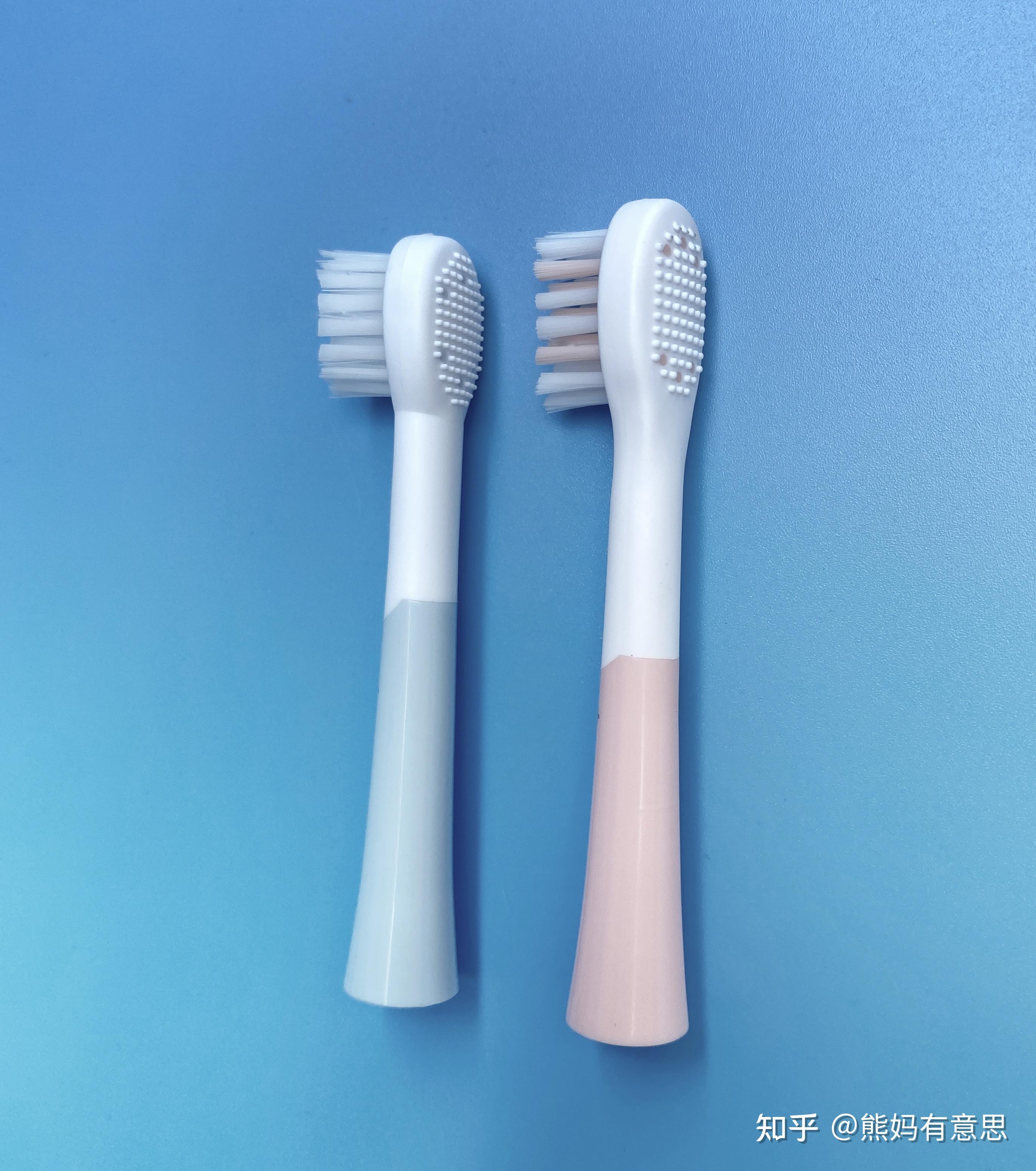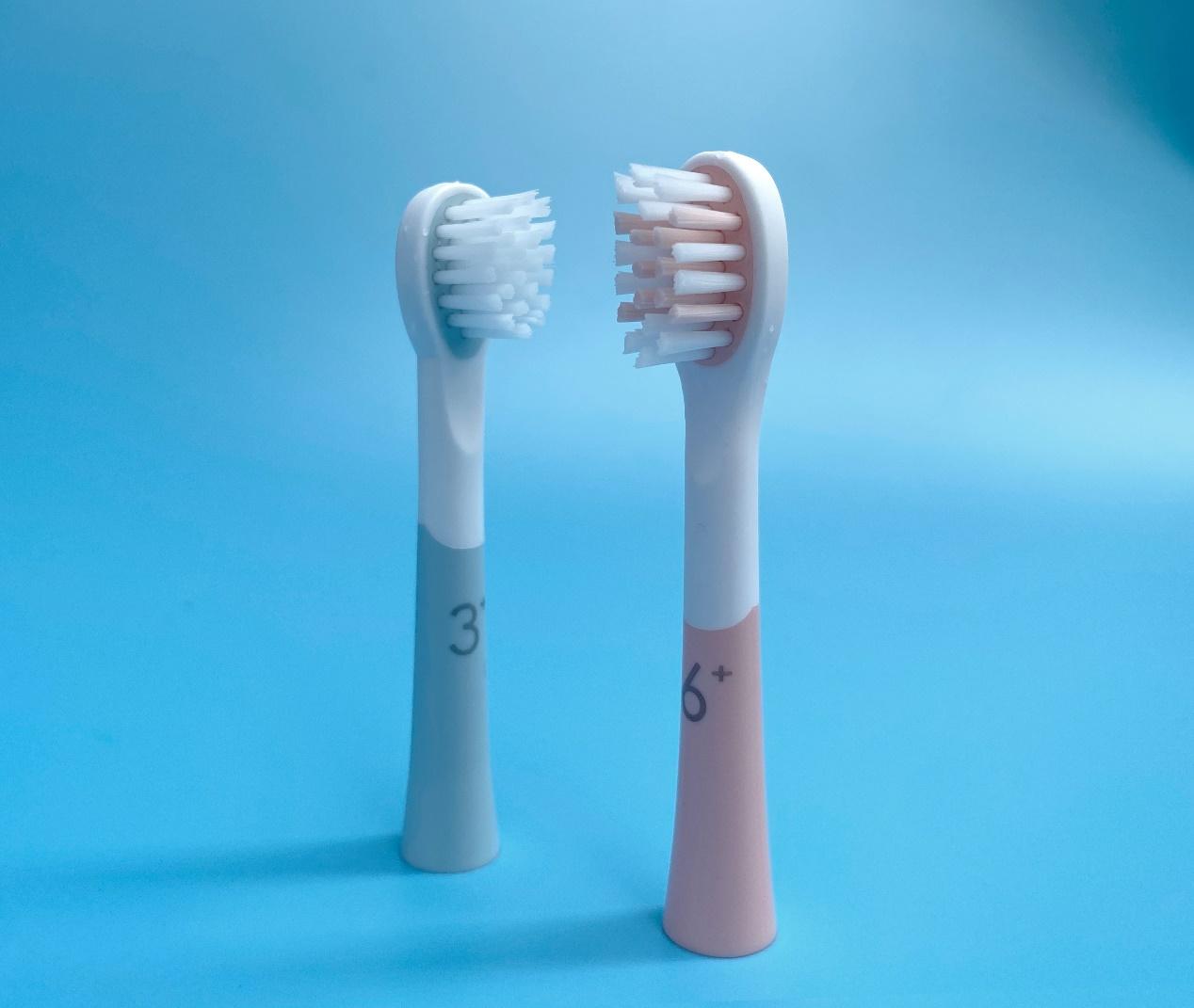 RIJIOO牙刷强调“分龄护齿”,刷头设置、震频根据小朋友年龄有所区分,我家两小只分属3+段和6+段,两支牙刷摆在一起对比,刷头差异还是蛮明显的。