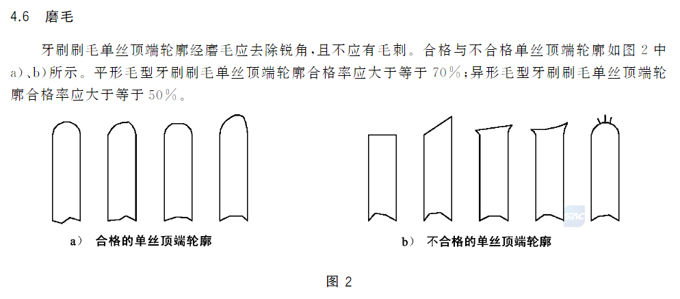 刷毛顺滑的: 刷毛顶端需磨圆,无毛刺,避免对牙龈的磨损。
